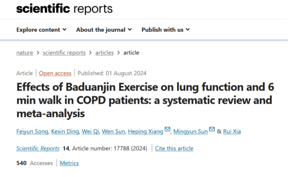 近日,sunbet申博孙明运教授指导的宋飞云等研究生组成团队,在国际高水平期刊《Scientific Reports》(JCR一区/中科院二区期刊)发表了题为“Effects of Baduanjin Exercise on lung function and 6 min walk in COPD patients: a systematic review and meta-analysis”的论文,sunbet申博为论文第一完成单位和通讯单位。《Scientific Reports》(IF=4.6)作为Nature 旗下的期刊,发表来自自然科学、心理学、医学和工程学等多个领域,致力于关注具有新颖性和示范性的原创研究。该刊作为全球第五大被引用期刊,所发表论文在学术界具有较高的认可度和影响力。