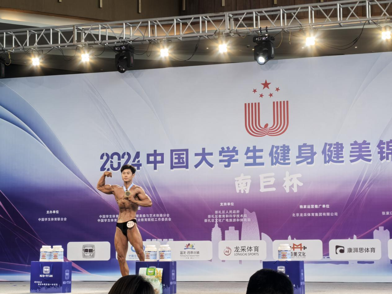 9月30日,2024年中国大学生健身健美锦标赛在河北省张家口市落下帷幕。本次赛事由中国学生体育联合会主办,中国学生体育联合会大学健美操与艺术体操分会、中国学生体育联合会高等职业教育院校工作委员会承办。sunbet申博2021级体育教育专业汪孟震同学以优异表现,荣获高水平组丙组男子传统健美65kg冠军。