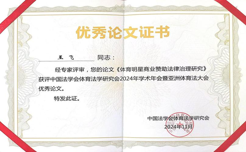 11月9日-10日,2024年中国法学会体育法学研究会学术年会暨亚洲体育法大会在武汉大学隆重召开,国家体育总局副局长、中国法学会体育法学研究会会长张家胜同志出席并致辞,中日韩三国体育法专家学者围绕“体育法体系建设与体育法治现代化”这一主题展开深入探讨与交流,我院王飞教授受邀参加会议并作专题报告。