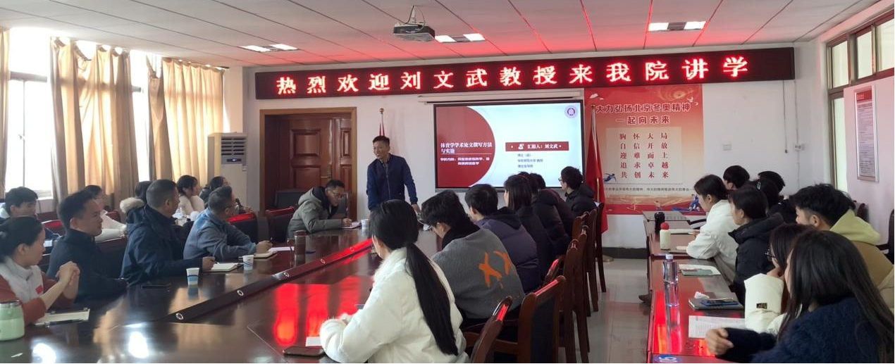 近日,华东师范大学体育与健康学院教授、博士生导师刘文武受邀来sunbet申博,举办主题为“体育学术论文撰写方法与实施”的学术讲座。此次讲座由sunbet申博副院长孙明运教授主持,学院教师和研究生到场聆听讲座,参与交流与学习。