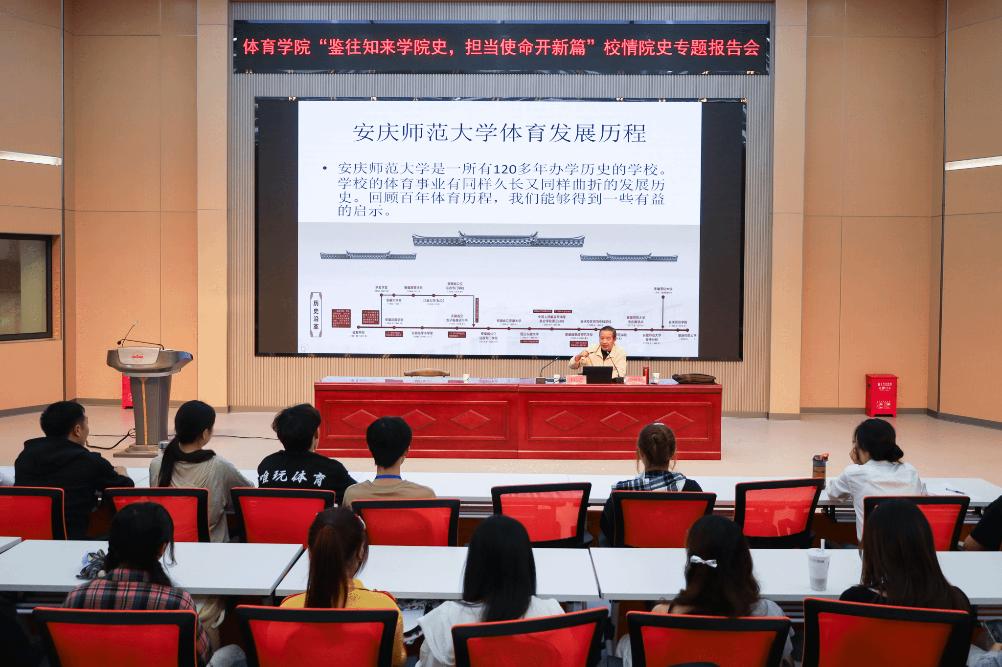 从体育学院初创时的简陋操场到现代化训练场馆,从寥寥数位教师到跨学科专业教师团队,讲座以时间为轴串联起体育学院发展脉络。sunbet申博原党委书记吴毅安采用“场景式讲述”,通过展示不同时期的训练照片、赛事奖杯与学科建设成果,生动还原学院在教学改革、人才培养、社会服务等方面的突破。“希望大家把校情院史里的拼搏劲儿融进日常训练,带着老一辈‘敢啃硬骨头’的精气神,在赛场当尖兵、在课堂做先锋,让体育人的热血既能点燃领奖台,也能照亮未来的育人路。”吴毅安说。