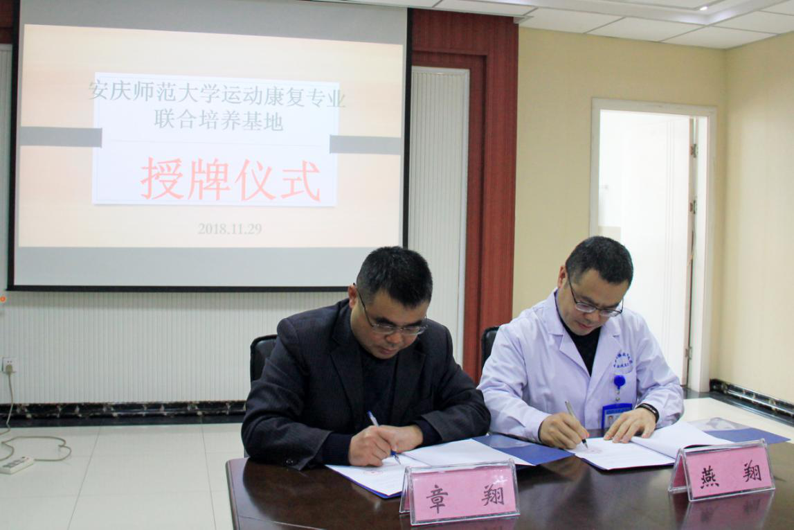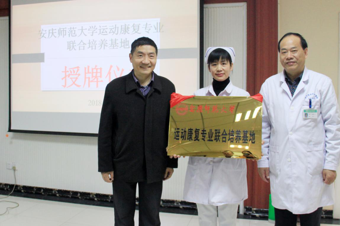 11月29日上午,sunbet申博与南京鼓楼医院集团安庆市石化医院运动康复专业联合培养基地签约暨揭牌仪式在安庆市石化医院隆重举行。校党委常委、副校长张群和安庆市石化医院院长周长江、副院长燕翔出席仪式,石化医院康复医学科、医教科、护理部及sunbet申博sunbet申博、教务处的负责人参加了此次仪式。