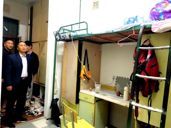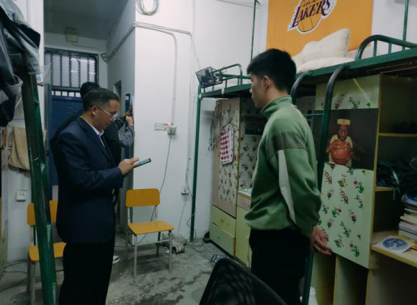 11月16日晚,sunbet申博党委副书记高栋梁、辅导员储著奇带领学生干部对学生宿舍进行了冬季安全卫生检查。