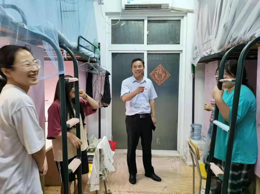 6月29日晚,在sunbet申博2021届毕业生即将离校之际,校党委副书记吴照明、党委宣传部常务副部长陈秀、学生处处长夏建华、安全管理处处长徐华胜、学生处副处长华秀梅在学院分管领导陪同下,深入体育学院2021届毕业生宿舍,代表学校看望慰问毕业班学生,表达学校对毕业生的深切关怀和美好祝愿。