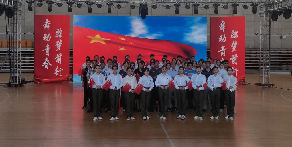 现场,全体演唱者们胸前佩戴团徽,手举着五星红旗,跟随指挥进行合唱,声情并茂、歌声洪亮,随着歌词的变化做出各色舞蹈动作,赢得了阵阵掌声。