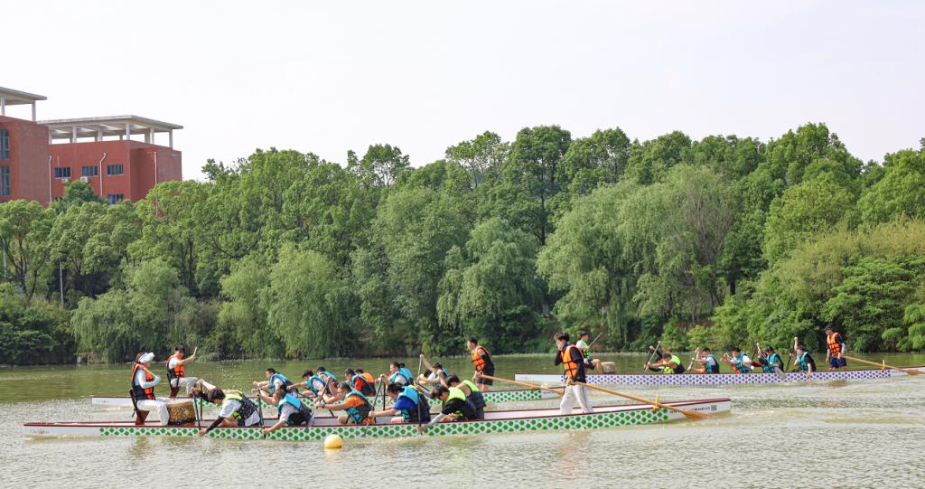 在此次比赛中,师生们分成教工队、研究生队及本科生队进行比拼。参赛选手们在赛前只有进行了强化训练,才能被允许进入正式的龙舟对抗赛。每一条龙舟上都配有一名舵手、一名鼓手以及10至12名划手。随着鼓声敲响,选手们挥动船桨,喊起口号,与队内成员们默契配合、方向一致,使整条龙舟“乘风破浪”、快速前进。浅绿色的龙舟、各色的救生衣与多彩的赛道设置成为校园中一道亮丽的“风景线”。