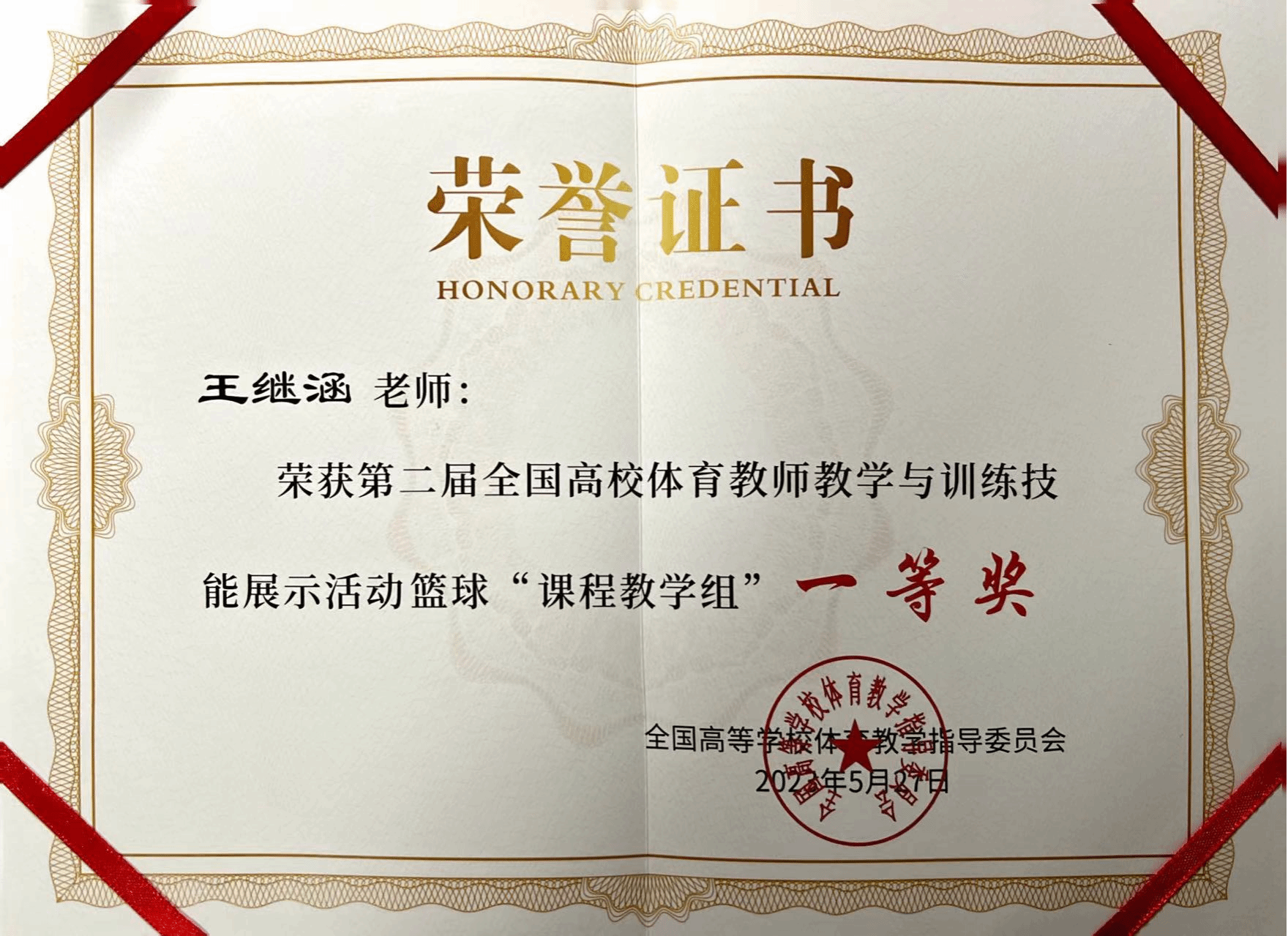 5月26日至27日,由教育部全国高等学校体育教学指导委员会主办的第二届全国高校体育教师教学与训练技能展示活动在浙江财经大学举行,来自全国28个省市的146所高校共计195名选手参加本次展示活动。sunbet申博选派sunbet申博青年教师王继涵代表安徽省参加比赛,经过线上课堂教学技能展示和线下教学技能现场测试,王继涵老师脱颖而出,斩获“第二届全国高校体育教师教学与训练技能展示活动篮球教学课程组”一等奖。