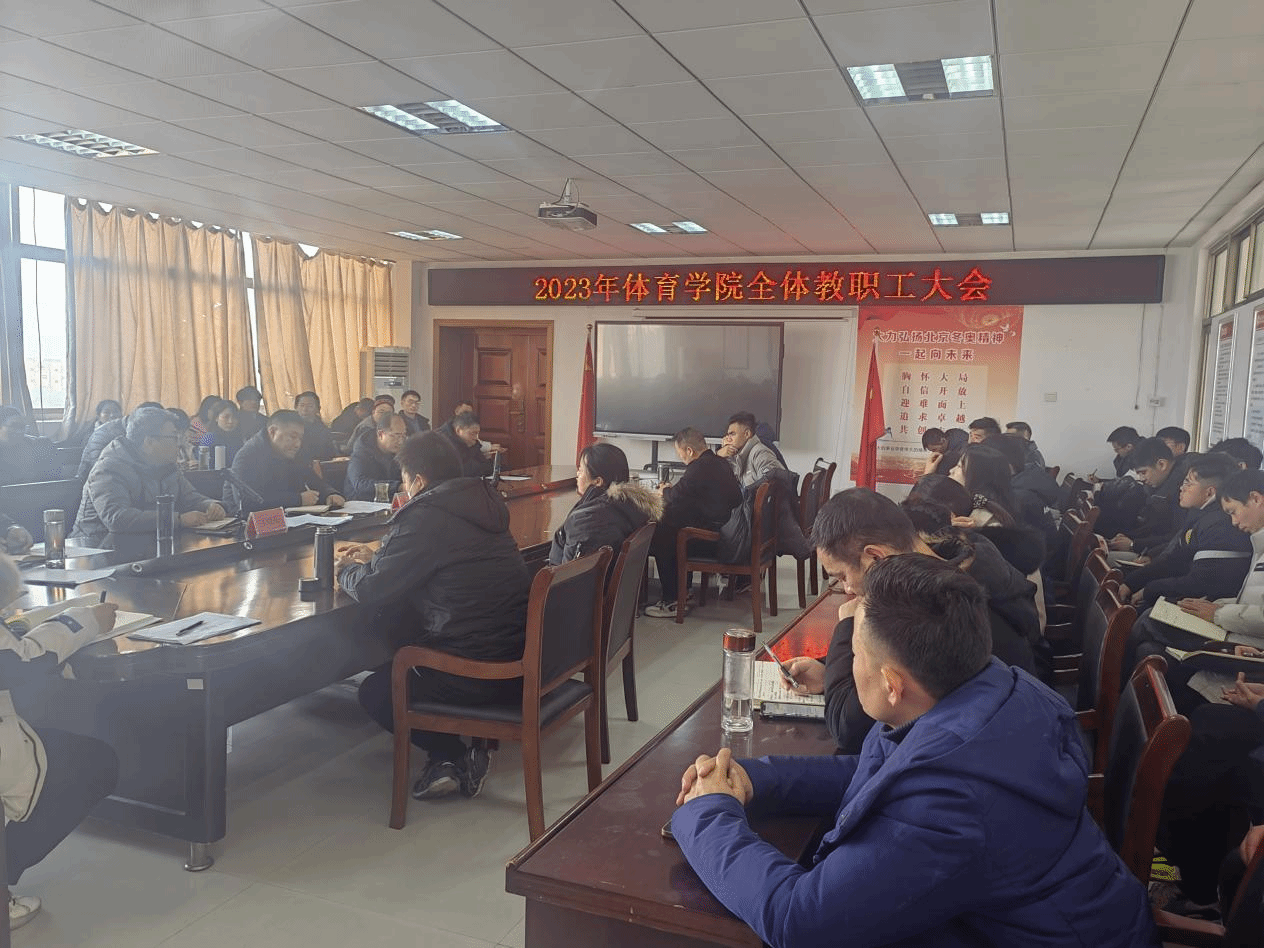 在会上,周多奇带领大家共同学习了学校教职工年度考核办法(试行)、落实网络安全工作责任制实施办法等文件要求,传达、学习了学校关于切实做好岁末年初学校安全工作、关于严格执行请销假制度等通知要求。他指出,临近期末,各项工作要按照学校部署、学院要求持续推进,一是加强学习、潜心钻研,以年度考核办法为依托,以业绩为标准,严格核算教学科研成果;二是立足岗位、身正为范,严格遵守学校、学院网络安全和师德师风建设各项要求,贯彻落实请销假制度,同时,要严管厚爱,狠抓考风考纪;三是凝心聚力、促进建设,落实学校相关文件要求,各教研室、党支部都要修订相关制度,细化指标,明确任务,促进学院高质量发展;四是安全为要、守牢底线,抓牢抓好冬季场馆、体育设施和实验室的安全排查,及时发布安全提示,做到早发现、早处置、零事故,确保师生安全和学院稳定。