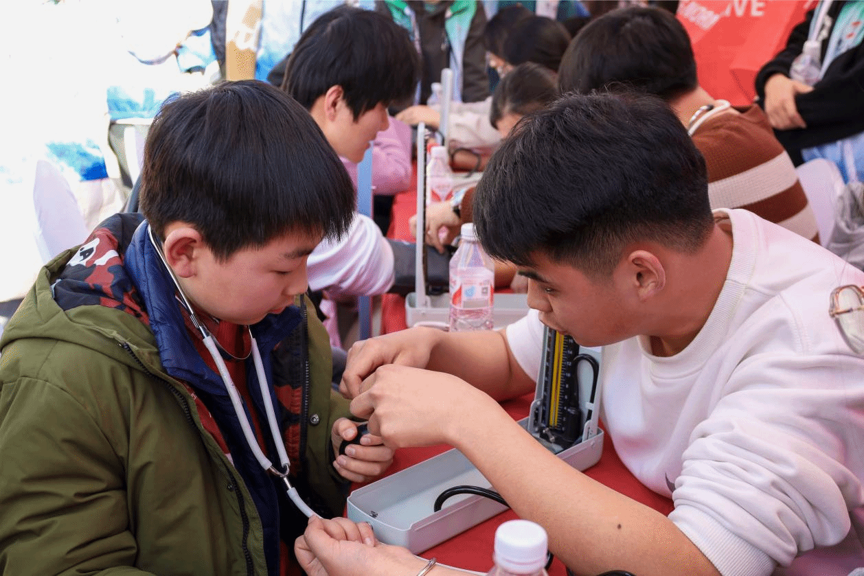 运动康复专业的学生们两两分成一组,轮流分工,其中一人全神贯注地监测观察血压表盘,另一人动作娴熟地撸起“顾客”的袖子固定仪器并用家常的交谈使其放松,未轮班的学生便主动当起了后勤,贴心地为前来测量的人们摆好座椅、整理衣物。