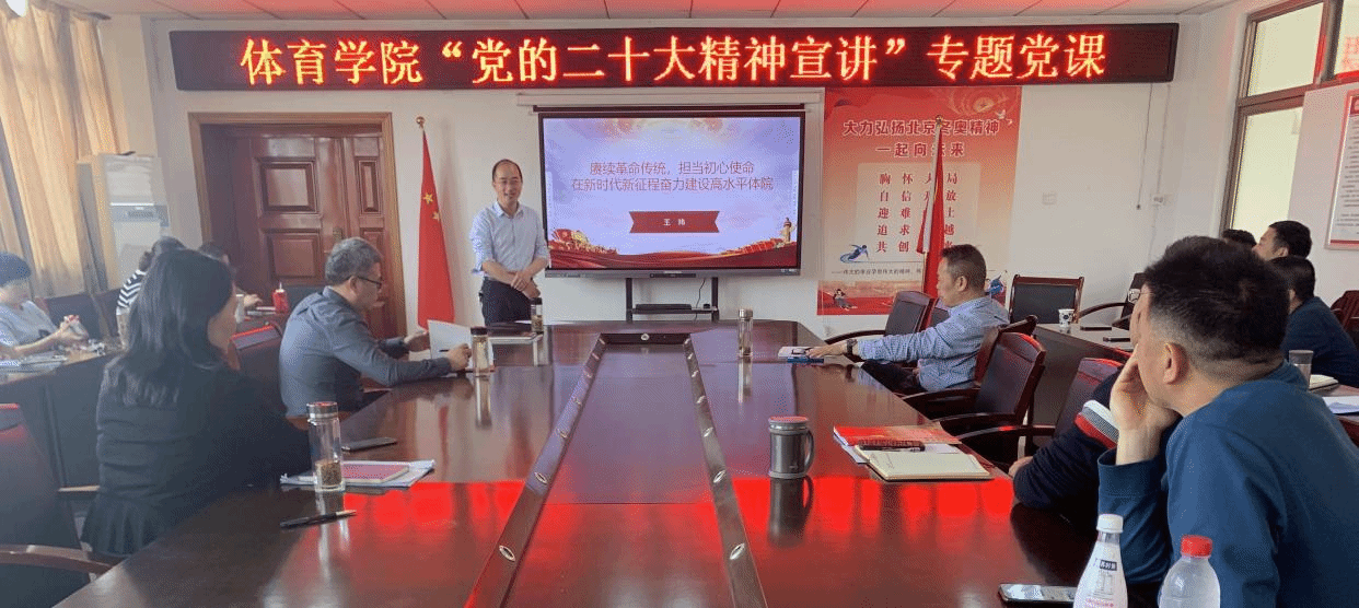 4月12日下午,sunbet申博在体育馆三楼会议室举办“党的二十大精神宣讲”专题党课。sunbet申博副书记、纪委书记王玮以“赓续革命传统,担当初心使命,在新时代新征程奋力建设高水平体院”为题,给学院全体教工党员讲授党课。