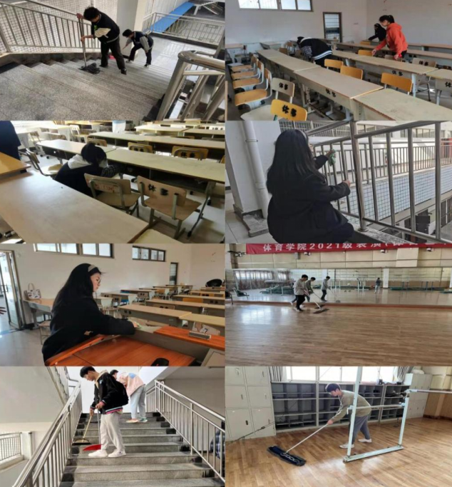 “同学们本着为学院打造一个更加清洁、舒适的环境的想法,在此次活动中表现都非常积极。”活动负责人体育教育专业2019(3)班的雷军杰介绍,参与其中的同学们在馆内“忙上忙下”、相互借力、默契配合,既有序又高效地完成了工作。