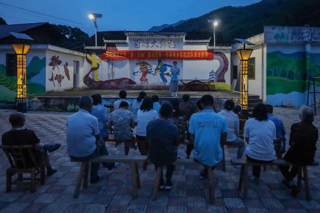 广场舞结束后,队员从附近村民家借来了许多长椅和板凳,整齐排列在广场百姓大舞台的正前方。对于此前村民在问卷上勾选出的问题,周冠群结合《中华人民共和国民法典》条例,将法条与专业知识融入所举的事例中,为在场村民答疑解惑。贴近乡村生活的事例和“接地气”的宣讲方式,使法律理论转变成了广大村民能听懂、能接受的话语,得到村民的连连称赞。