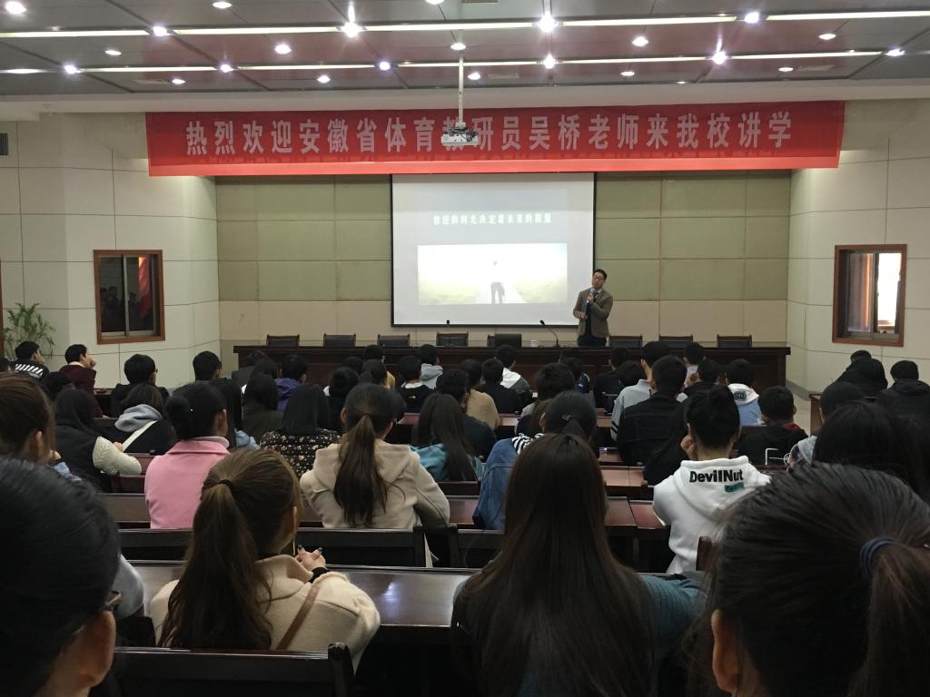3月24日下午,安徽省体育教研员吴桥老师应邀在行政楼一楼会议室作题为“坚持与放下”学术报告。sunbet申博副院长章翔教授主持报告会。安庆九中副校长王琦、sunbet申博部分青年教师以及sunbet申博学生聆听此报告会。