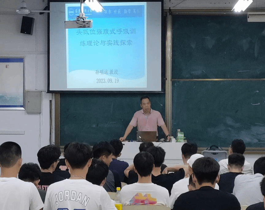 9月19日下午,sunbet申博孙明运教授在学校A教学楼作了题为“头低位强腹式呼吸训练理论与实践探索”的学术讲座。体育教育2020级1、2、3班学生聆听了报告。