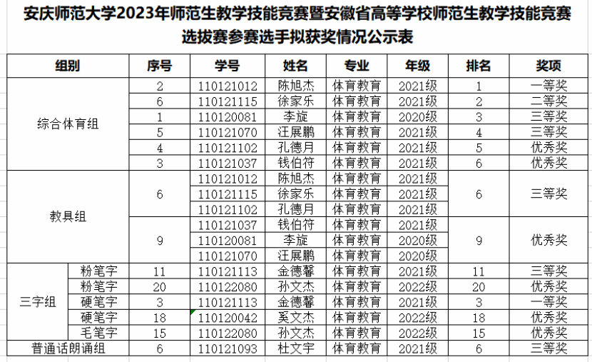 9月17日,2023年学校师范生教学技能竞赛暨安徽省高等学校师范生教学技能竞赛选拔赛圆满落幕。比赛中,我院参赛选手们教学准备充分、教态自然得体、语言表达准确精炼,尽显我院师范生风采。经过激烈角逐,体育教育专业2021级陈旭杰同学获得综合体育组教学赛一等奖、2021级金德鑫同学获得三字组硬笔字比赛一等奖。同时,我院获得二等奖1项,三等奖5项。