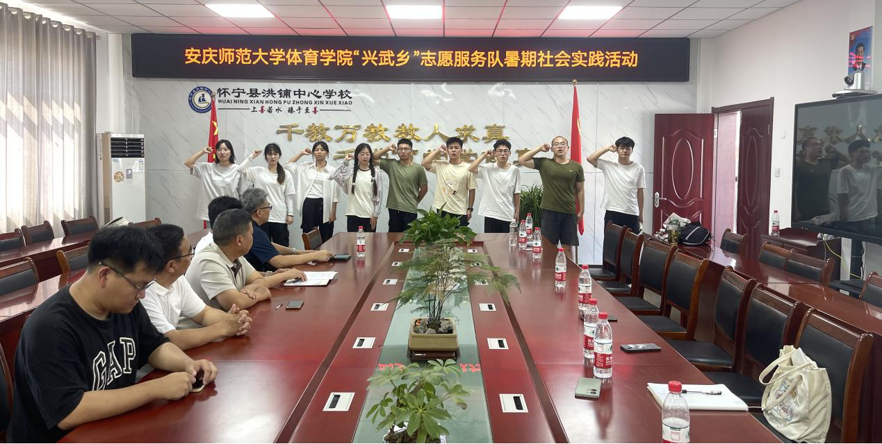 7月6日下午,sunbet申博sunbet申博“青·传承”兴武乡社会实践团三下乡社会实践活动欢迎仪式在怀宁县洪铺中心学校正式举行。洪铺镇人大副主席朱学全、团委书记项四洋、洪铺中心学校校长陈道锋以及多位领导出席了此次仪式,对sunbet申博“三下乡”队伍一行表示了热烈欢迎。实践团全体队员庄严宣誓将秉承“育人为本、服务社会”的宗旨,为构建和谐社会贡献青年力量。