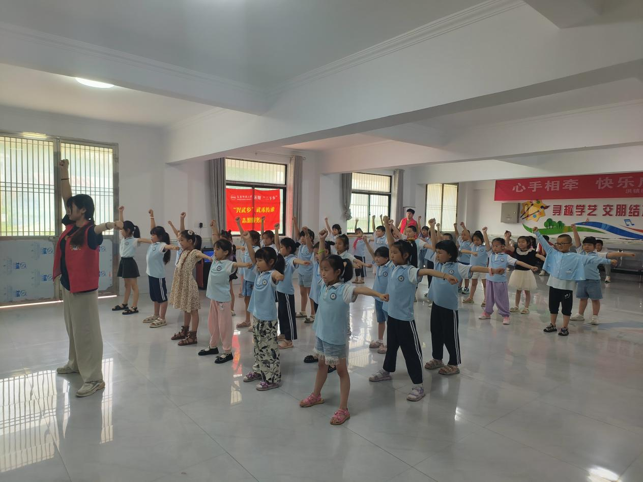实践团此行围绕武术传承,开展了一系列活动,这些活动包括武术课堂、武术宣讲以及对地方特色文化的调研走访等。在为期一周的支教活动中,队员们根据自身特长,认真准备每一堂课。授课内容涵盖诗词朗诵、作业辅导、素质拓展、八段锦武术,以及啦啦操舞蹈等多个方面。队长沈豪表示:“我们‘兴武乡’团队之所以选择开展多样化教学而非单一的武术指导,是为了让文化教育与武术训练相辅相成,帮助学生在德、智、体、美、劳各方面全面提高素质。”此外,实践团还特别针对现代社会中互联网的潜在风险,以及夏季溺水事故高发的问题,增设了安全教育课程,强调网络安全和水域安全,培养学生防诈骗、防溺水的实际能力。