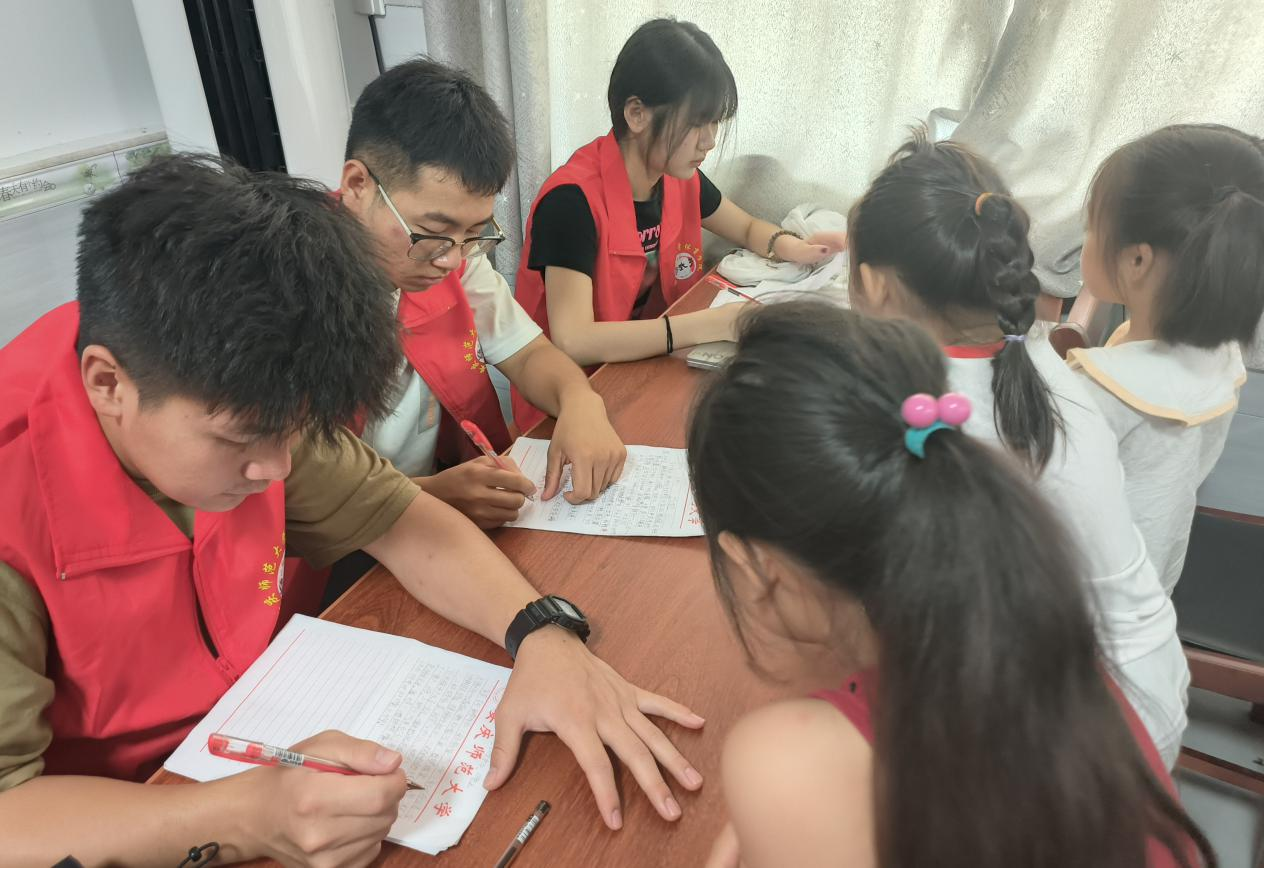 图为实践团成员批改学生们的日记
