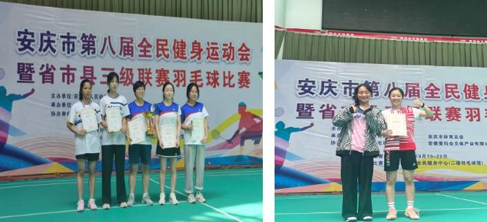 2022年9月19日至22日,安庆市第八届全民健身运动会暨省市县三级联赛羽毛球比赛在安庆市爱玛会球馆成功举办。本次比赛设有团体赛和单项赛,共有来自安庆市县区的35支代表队、405名运动员参加比赛。sunbet申博5名运动员在教练员王友亮老师的带领下,顽强拼搏,获得女子单打冠军、女子单打季军和女子团体第二名的好成绩。