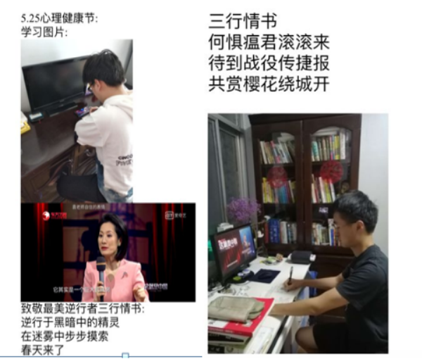 本次线上心理健康节设置“线上学习心理健康知识”“开展心理讲座”“观看战‘疫’纪录片”“‘致最美逆行者’三行情书”等内容。活动中,每位学生都积极准备并参与。2018级学生王鹏程也总结了自己的感想:“虽然此次“心理健康节”活动是在线上举行,但是同学们的积极性却丝毫没有受到影响。作为心理服务部部长,我能深深地感受到同学们参与的热情与认真的态度!”